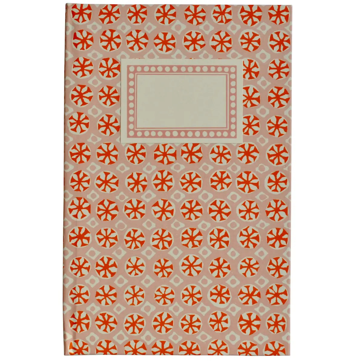 - 80 pages of plain cream paper, sewn properly and bound into a slim, light hardback notebook, covered in patterned paper, that opens completely flat