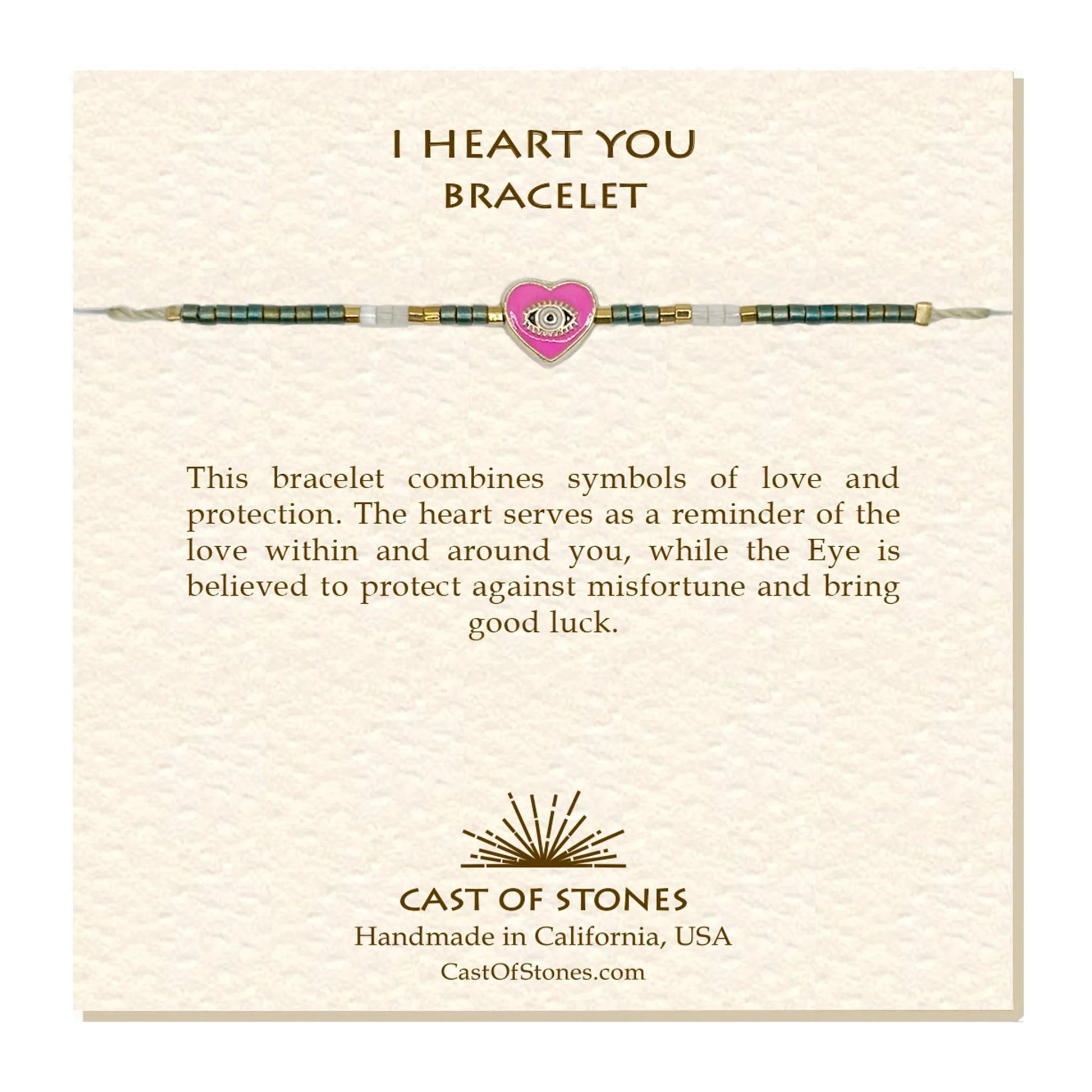 - This bracelet combines symbols of love and protection. The heart serves as a reminder of the love within and around you, while the Eye is believed to protect against misfortune and bring good luck.