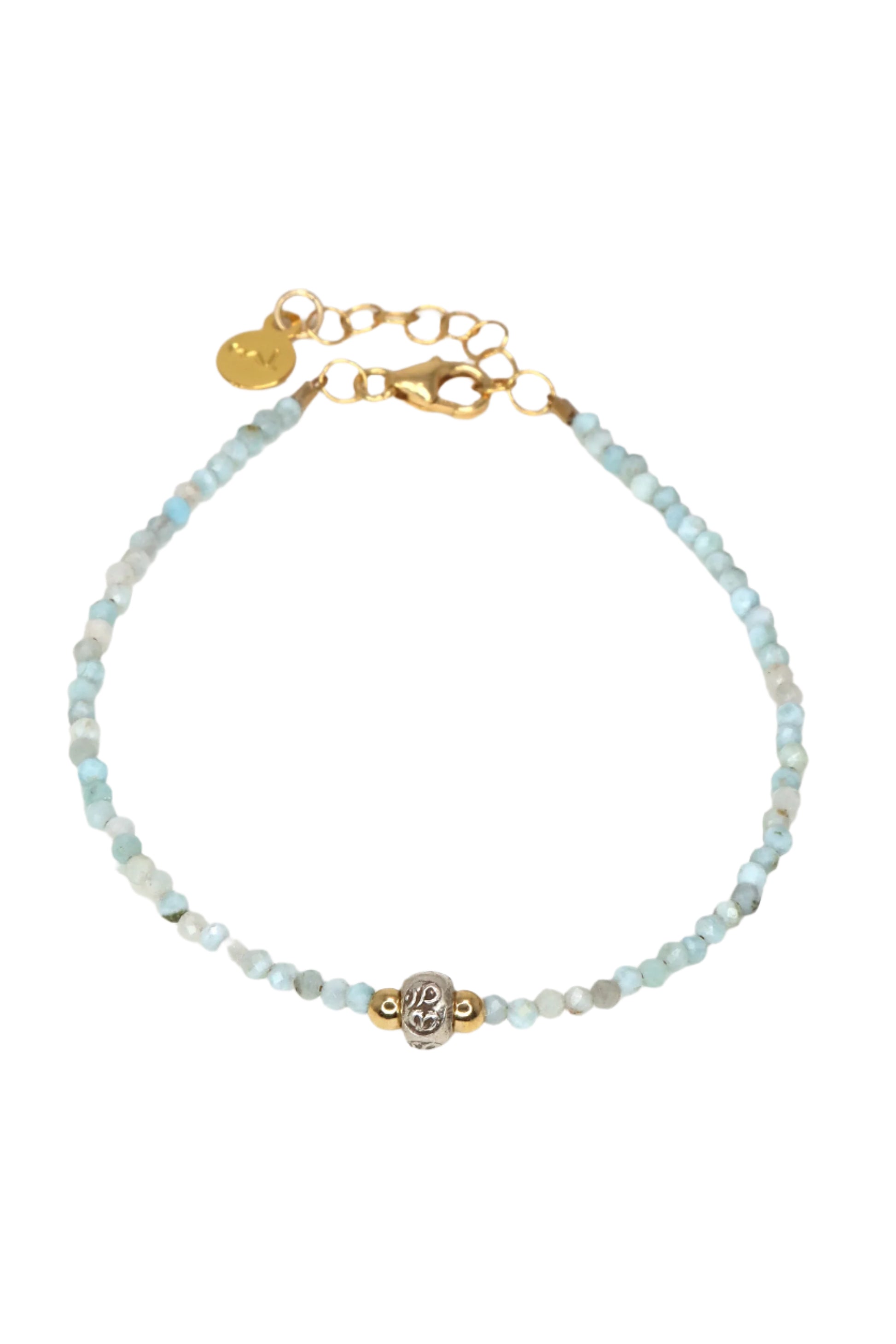 - Faceted larimar bracelet with Hill Tribe silver om bead and 14k gold filled accents. 14k gold filled lobster clasp and extender chain.