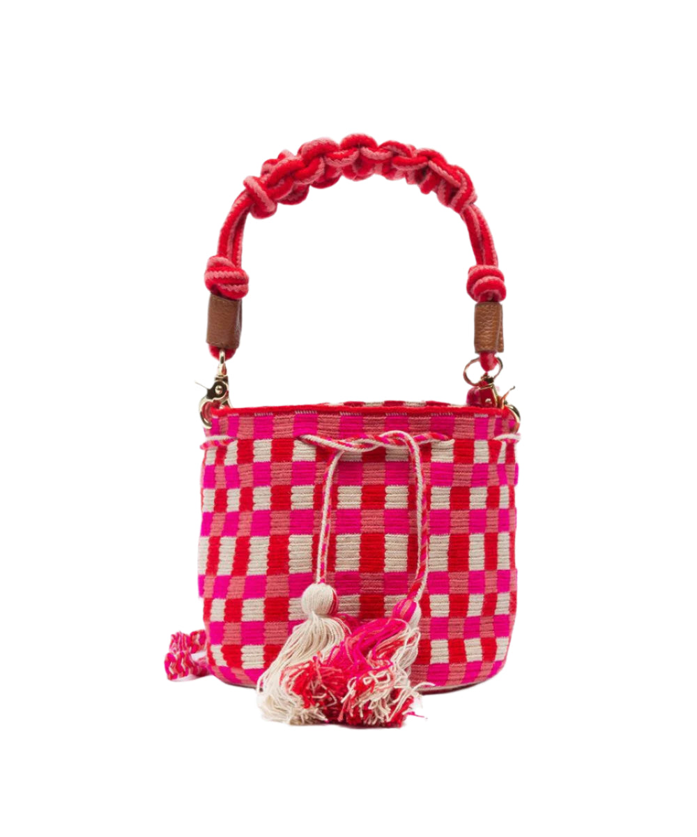 - The bag is made from high-quality materials and features an intricate macramé pattern on its short handle. Its crossbody design allows you to wear it over the shoulder or across the body.