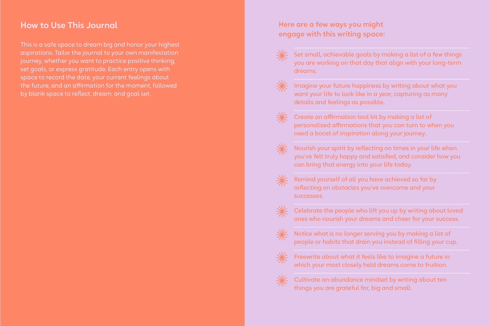 - Inviting and brightly designed, this fill-in journal can be tailored to your own manifestation journey, whether you want to practice positive thinking, set goals, or express daily gratitude.