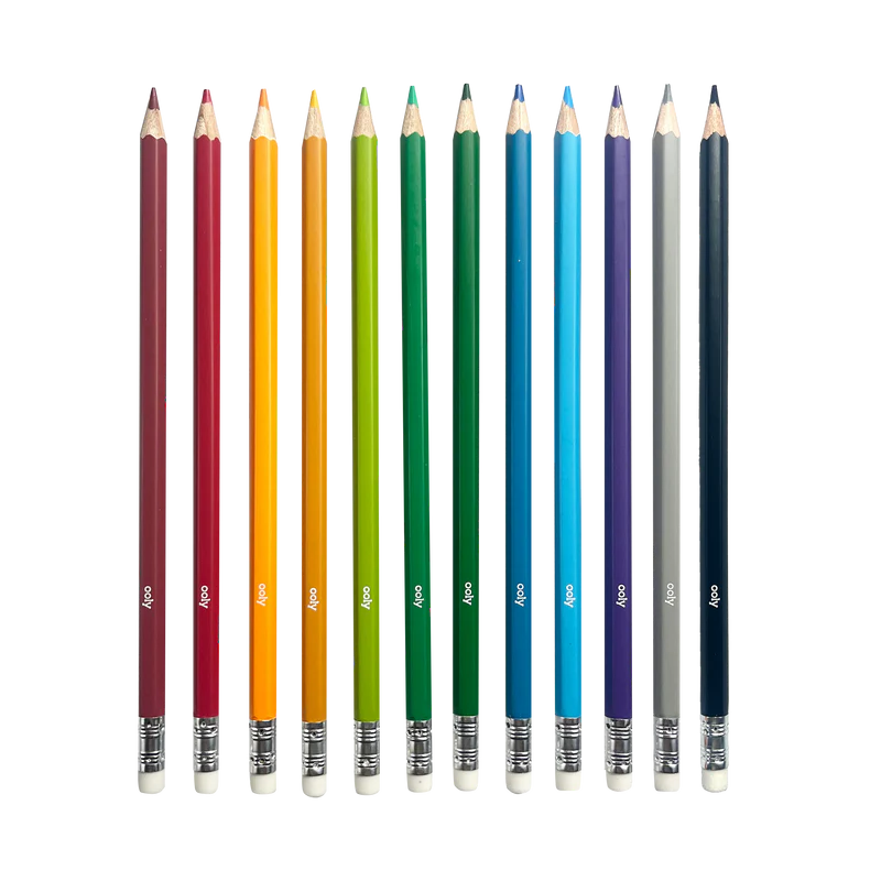 - Pencils include a rainbow of colors including red, blue, green and yellow