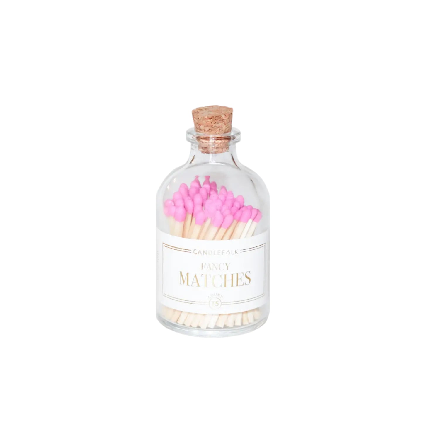 - Colored tip matches in an apothecary-inspired glass bottle with a cork top and a striker on the bottom