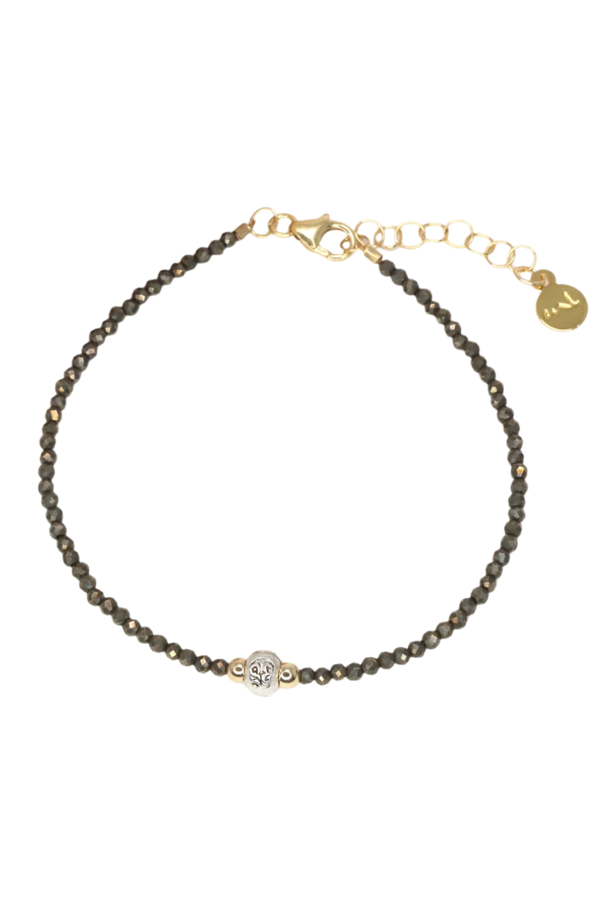 - Faceted pyrite bracelet with Hill Tribe silver om bead and 14k gold filled accents. 14k gold filled lobster clasp and extender chain.