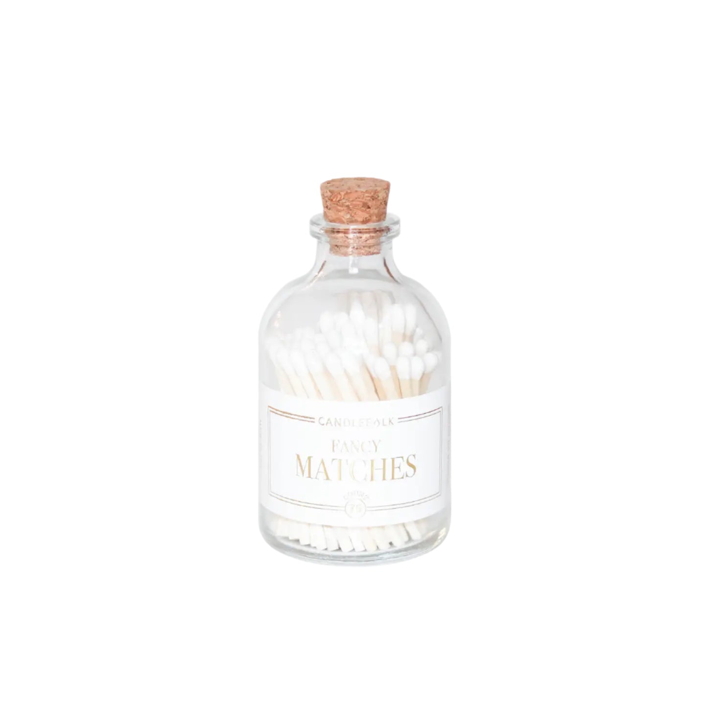 - Colored tip matches in an apothecary-inspired glass bottle with a cork top and a striker on the bottom